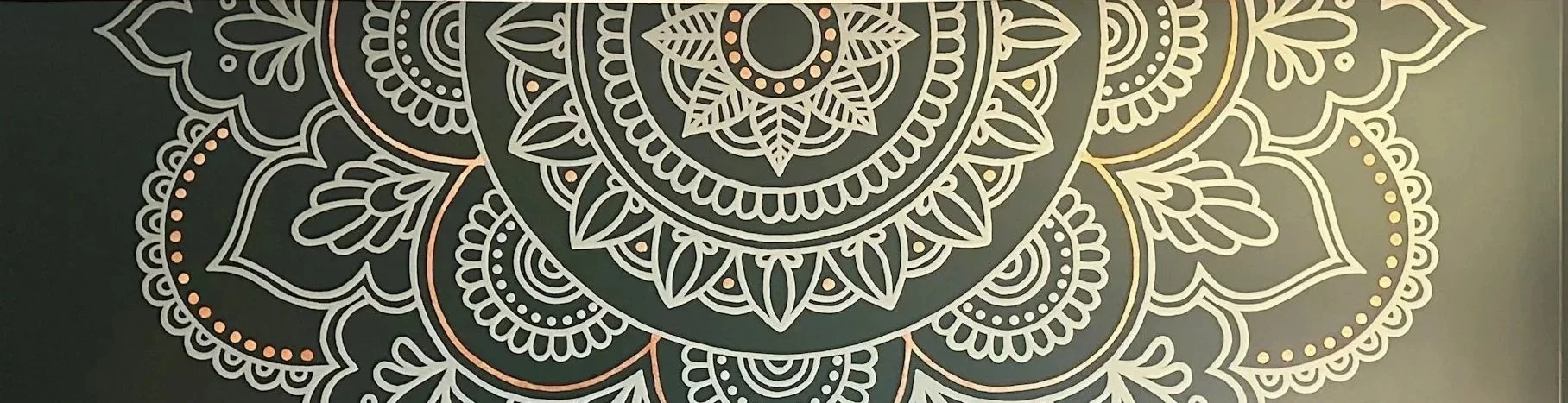 Repainted whole room in shades of green, with the mandala as the feature wall at the head of the bed. Used copper foil on parts of the mandala for a shimmery effect that catches the eye.